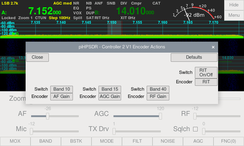 Les modifications une fois prises en compte, il est possible d'utiliser l'option "Menu/encoders" pour affecter une fonction autre que celle configurée par défaut. Dans l'exemple ci-dessous, les poussoirs des trois encodeurs du bas servent à commuter rapidement sur les bandes 10, 15 et 40 mètres